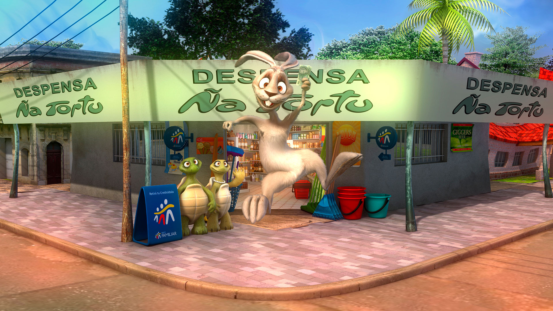 En 2010 diseñamos unos personajes para un comercial de Banco Familiar basado en la fábula de la liebre y la tortuga. Los personajes tuvieron mucho exito en la audiencia y pronto se convirtieron en las mascotas de Banco Familiar. Desde entonces continuamos animando nuevas aventuras con éstos fantasticos personajes.