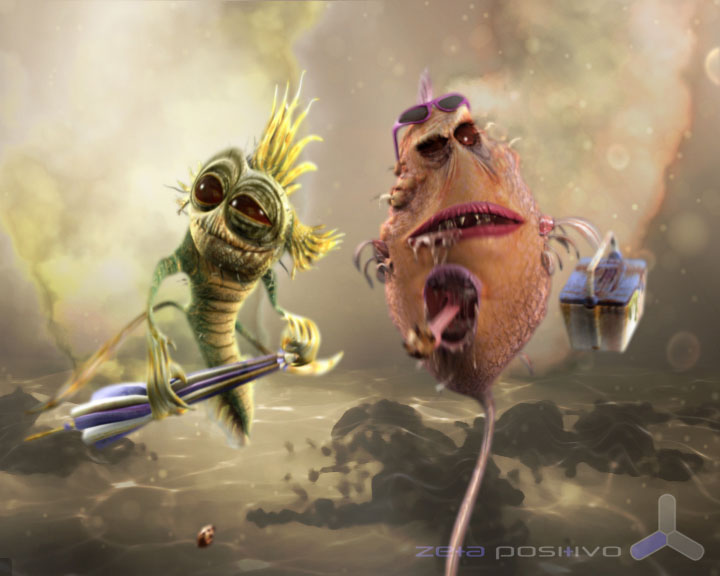 Los personajes se modelaron y texturizaron exactamente como las referencias provistas por el cliente (ver boceto abajo)La creación de estos personajes incluyó un desarrollo y programación especial para simular el comportamiento de las aletas, colas, babas, sombrilla y crestas debajo del agua. Un detalle a destacar es el bocadito que se manduca uno de los personajes, teniendo en cuenta que estamos dentro de un inodoro!!!. |